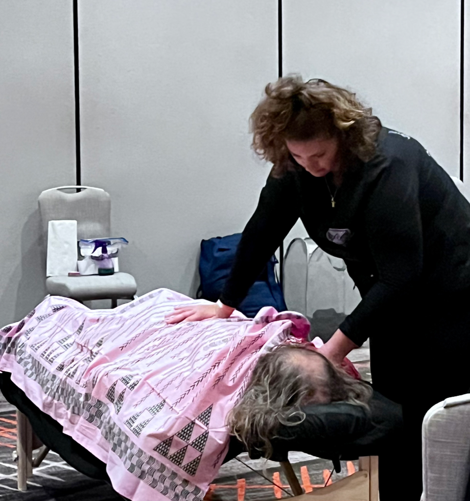 • Pā Iwi Ola staffer Brandi Bussell performs therapeutic lomilomi massage on clients who were impacted by the recent Maui wildfires.