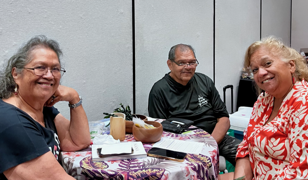 • From left to right: Allysyn (Aunty Aloha) Bezilla, Nelson Kamilo Lara, and Leni English, Haku Hoʻoponopono Practitioners from Uncle Likeke and Aunty Lynette Paglinawan provide kūkākūkā sessions to those impacted by the recent Maui wildfires.