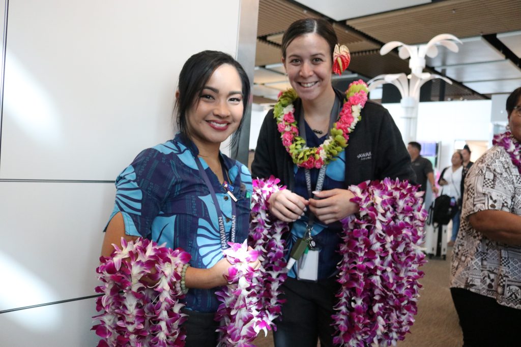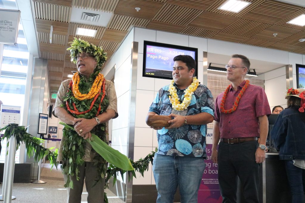 Hawaiian Airlines CEO Joe Sprague joined employees who celebrated the anniversary alongside guests prior to the departure of flight HA465 from Honolulu on Thursday afternoon. Festivities are also planned in Pago Pago, including a community service event.
