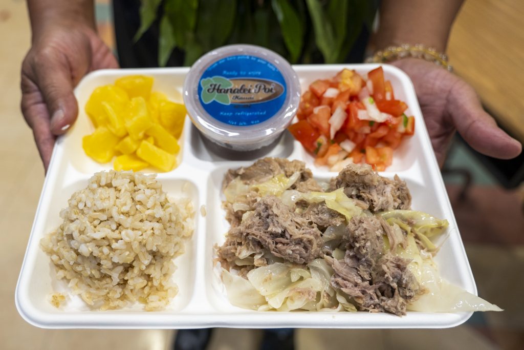 Chiefess Kamakahelei Middle School on Kaua‘i served the poi on Friday to complement their lunch menu offering of kalua pork with cabbage, lomi tomato, brown rice, edamame and pineapple chunks.