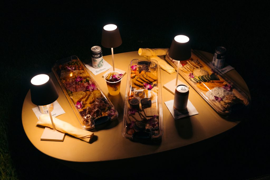 Personal Charcuterie Boards are available for purchase, starting at $30. The venue also features a “Roots & Barrel” bar trailer selling fine wines, local craft beers, non-alcoholic and keiki beverages. Libations start at $15 per person. Outside food and beverage are not permitted.