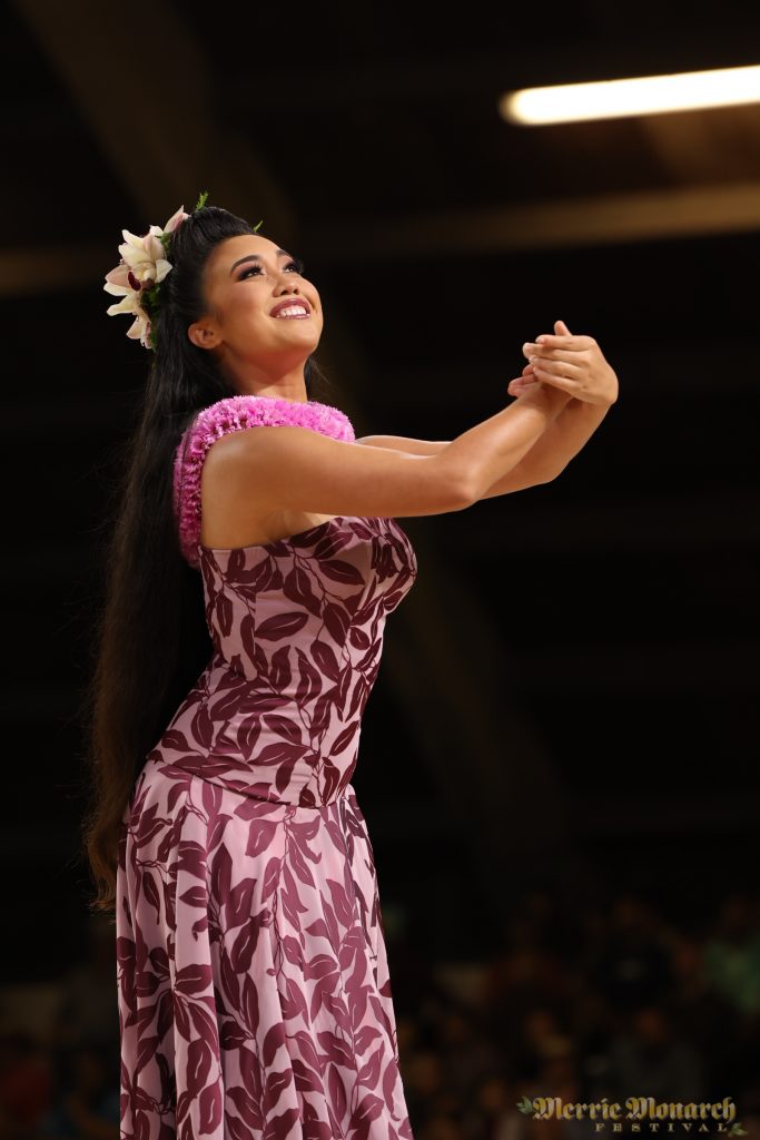 Kaʻōnohikaumakaakeawe performed a hula ʻauana to the mele “Kanani Molokai,” which celebrates her namesake Uncle George Ainsley Kananiokeakua Holokai, a respected Kumu and chanter. Her kahiko, “Aia Ka Lani Kua Kaʻa I Luna,” described the sacred pool of Anianikū. She earned a total of 1,164 points for her entries as well as the competition’s Hawaiian Language Award.