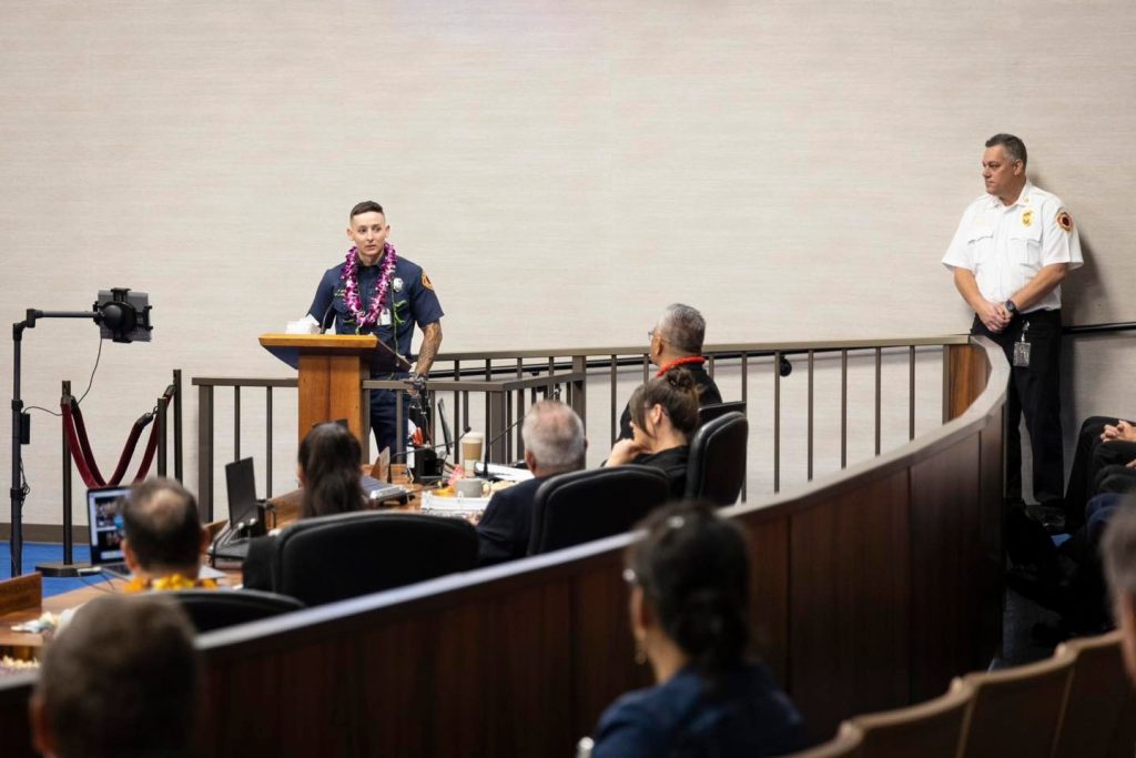 Maui Firefighter Tanner Mosher was honored with a ceremonial resolution on Friday for his heroism during the Aug. 8, 2023 wildfire in Lahaina.