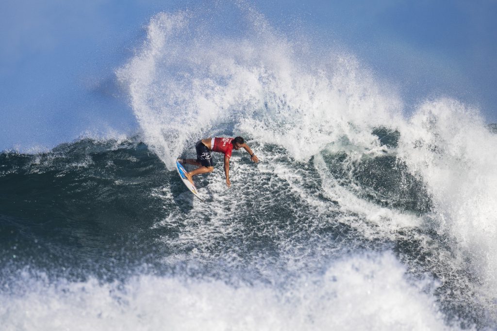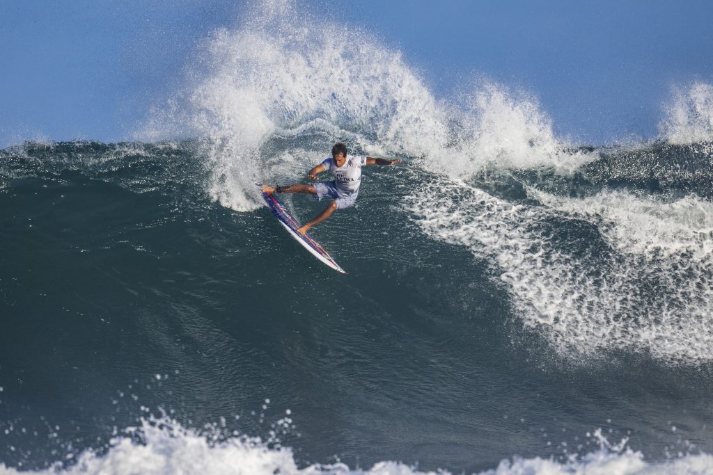 Solid six-foot sets continued to roll into Haleiwa, Oʻahu throughout the men’s Round of 64, Heats 11–16, Round of 32, and Quarterfinals on Sunday. The day saw 10 rides scoring 9.00 or higher, along with numerous excellent scores above 8.00, keeping spectators on edge.