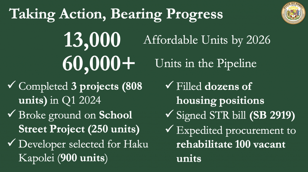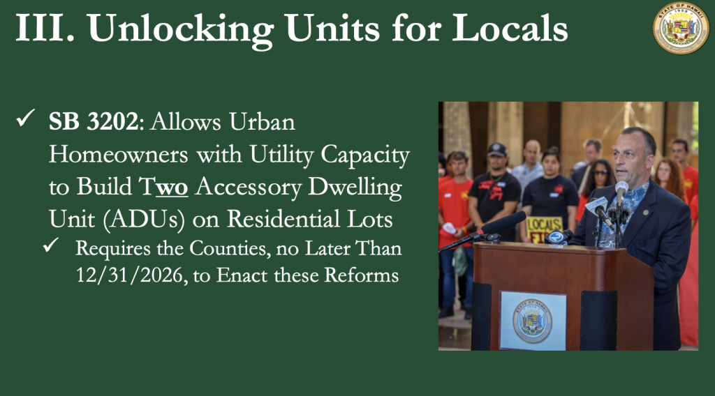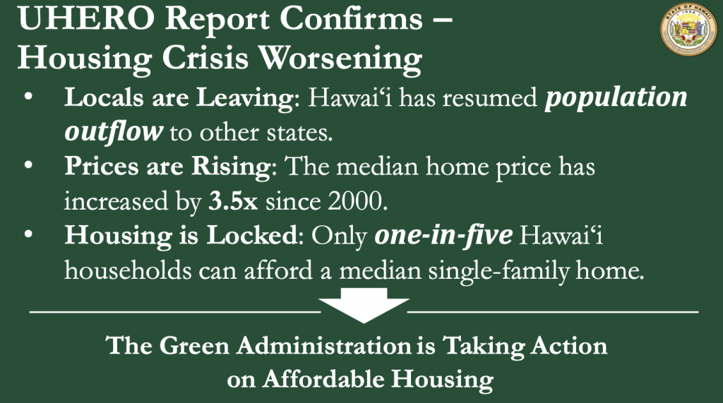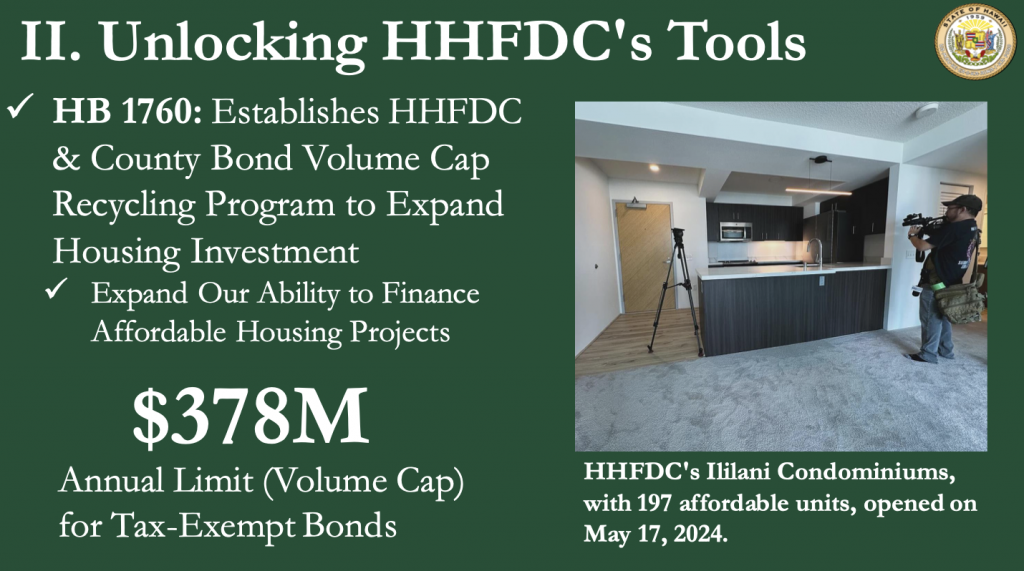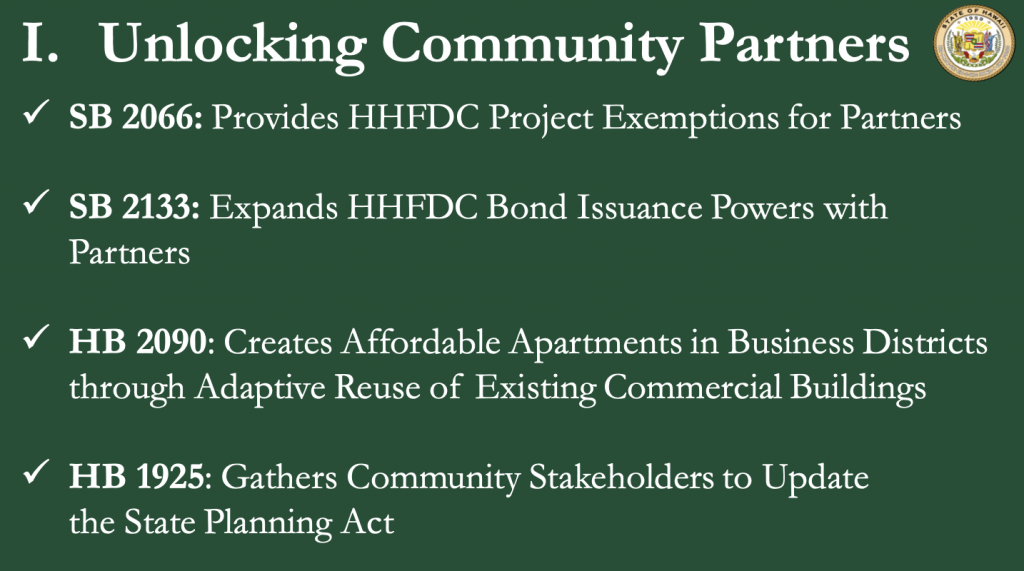 “These bills reflect the ongoing work to expand housing options for Hawaiʻi’s local people,” said Green. “Mahalo to our residents and communities that continue to share their perspectives, take part in the legislative process, and contribute to ongoing policy discussions to come up with innovative and sound solutions to address our dire housing shortage.”