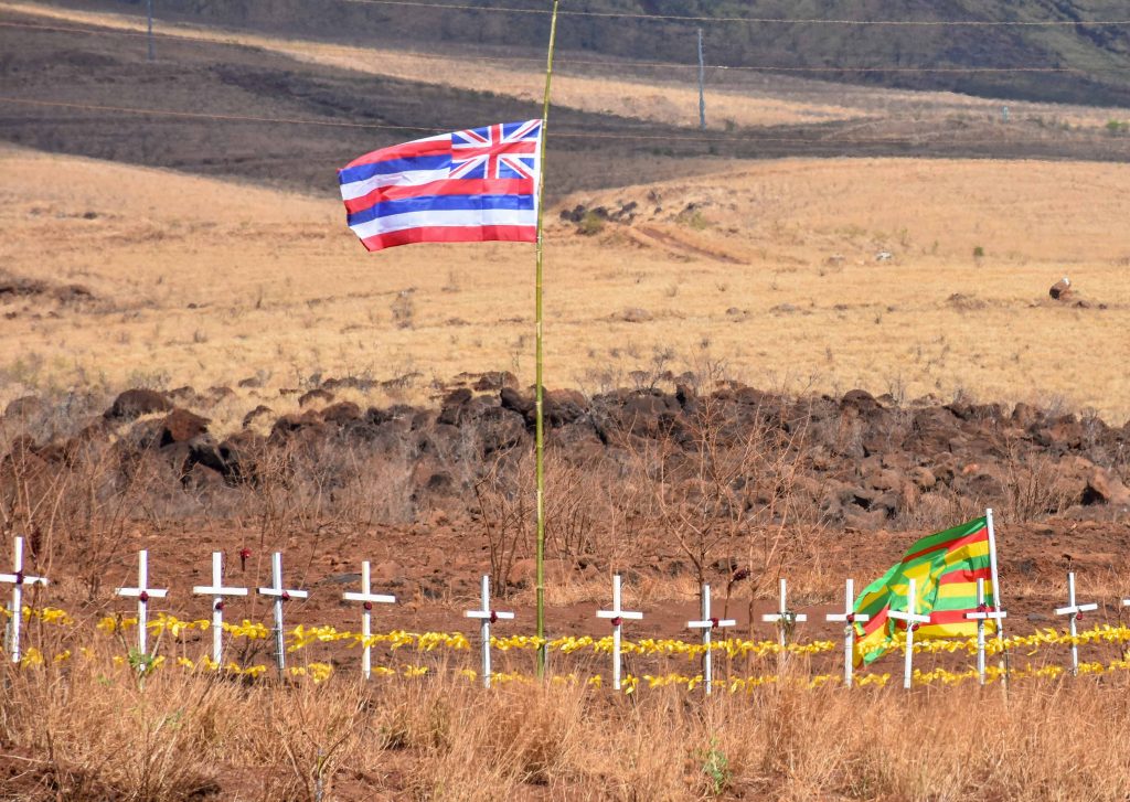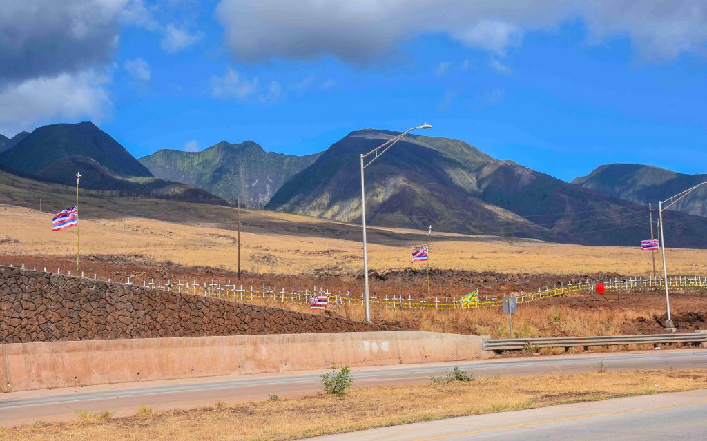 From the park, perched on a West Maui mountain, there is a sweeping panoramic view of what was once Lahaina but is now miles of destruction all the way to the ocean. Also in view from the park is a fence of white crosses that was put up by community members on the mauka side of the Lahaina Bypass.