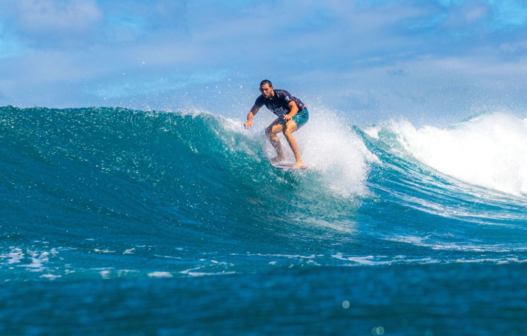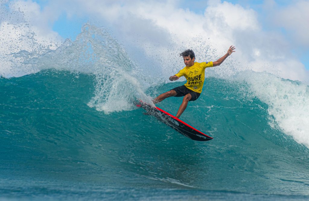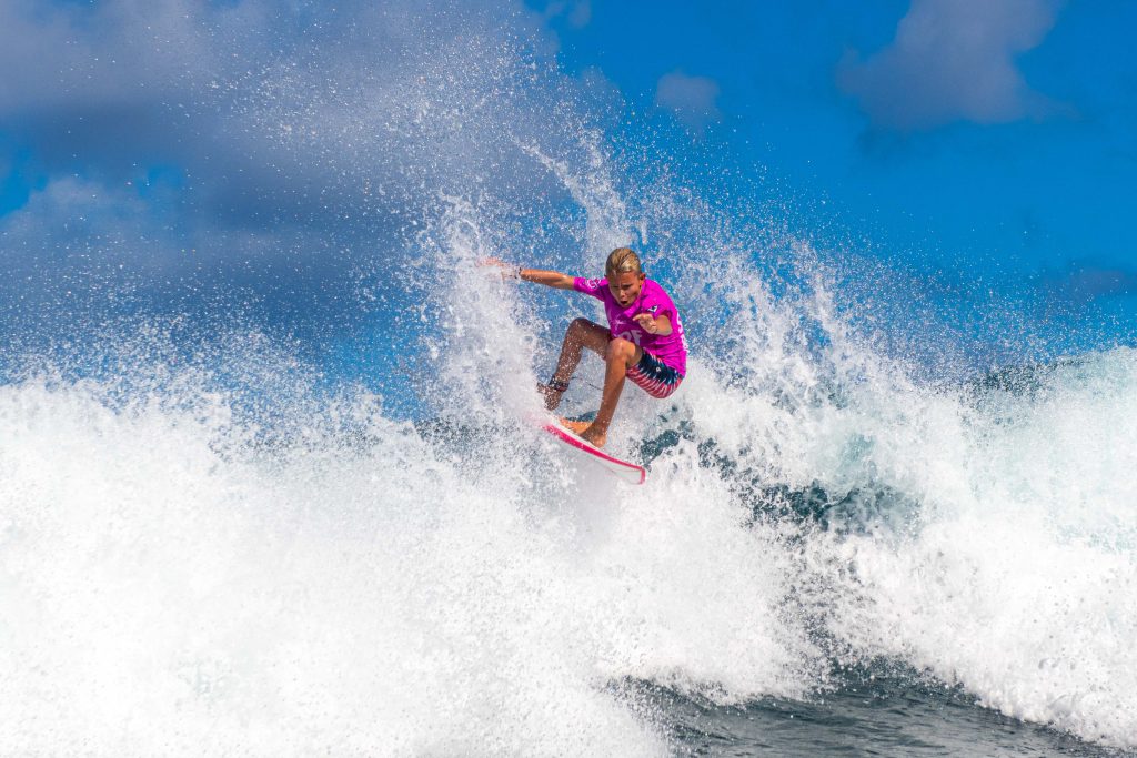 McClenahan described the wave that moved him into first. “I wanted to get a big snap, but I was a little bit late, and the wave was super foamy and bumpy so I bottom turned up and kind of like hit it under it and tried to project myself outward and I landed it. I knew I got the score to move into first.”