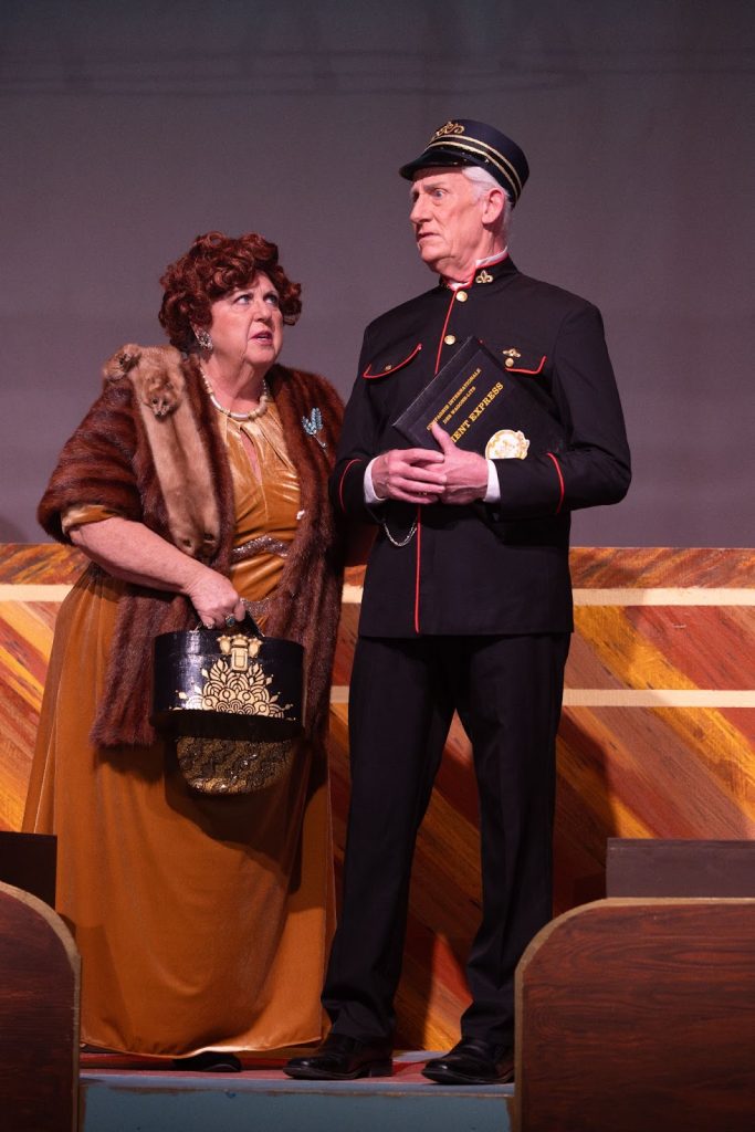 The Sewing Hui volunteers worked on alterations for the garments to make everything fit perfectly. “You can have the most beautiful suit or dress, but if it doesn’t fit, it is distracting and pulls focus. They also made some things from scratch, including Poirot’s dressing gown and vest, and Ratchett’s smoking jacket. The conductor’s uniform was embellished with red piping and gold trimmings to make it stand out on stage. Almost every garment had a little work done to it – hemming, adding details, fitting, embellishments, so that all the characters felt true,” said Oberg.