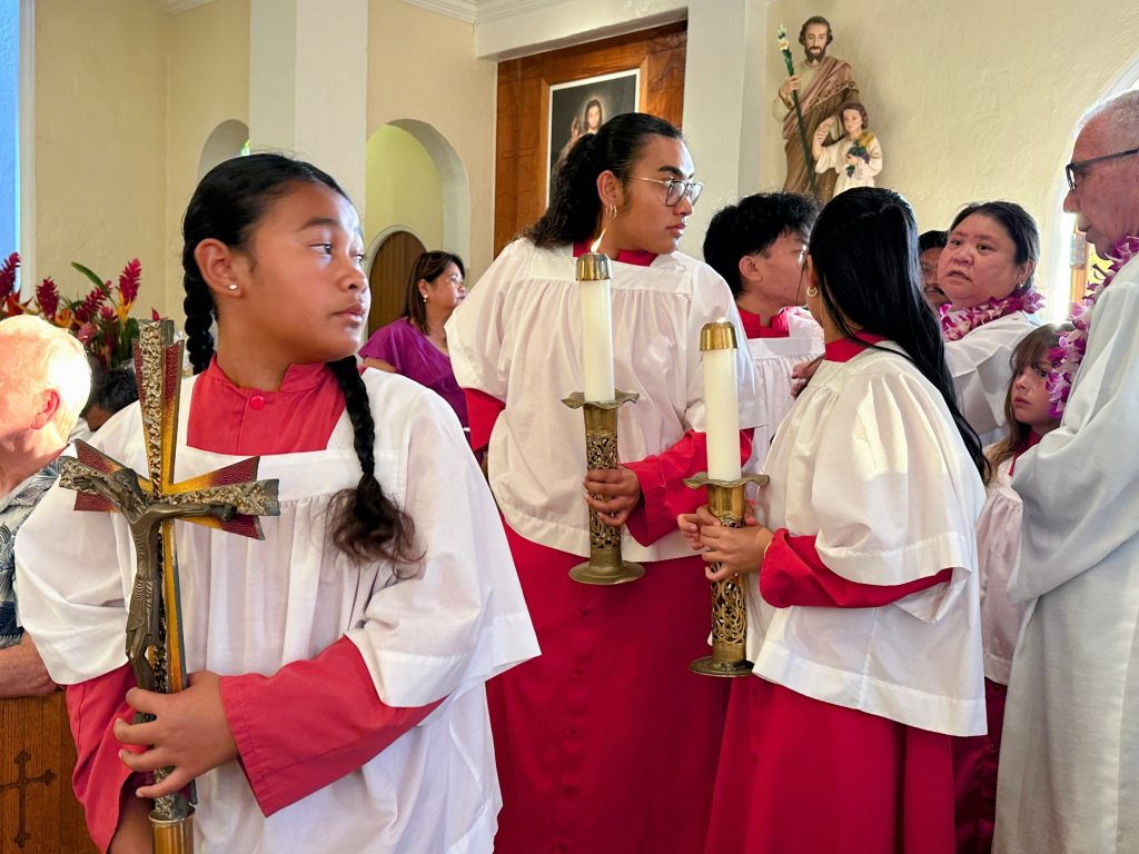 • Acolytes prepare to lead an opening procession into Maria Lanakila Church during Mass on Wednesday in Lahaina. PC: Brian Perry