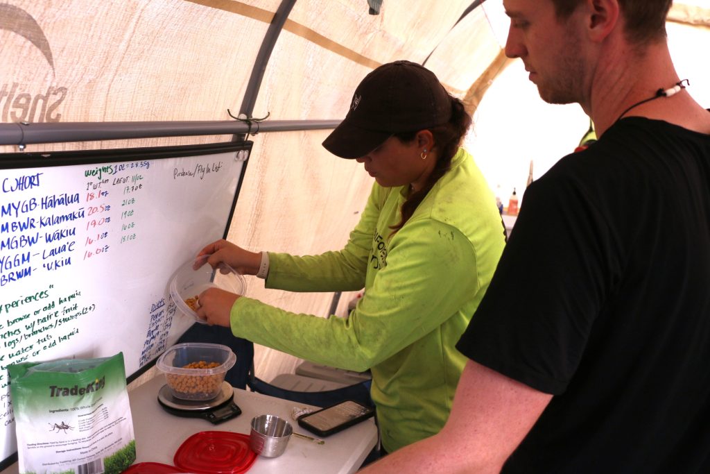 Two additional design elements unique to the Maui release are automated feeder boxes and Global Positioning System (GPS) tracking. The feeders are able to distribute food on-demand as a supplement to the birds’ wild diet. The GPS transmitters provide a second method to track the birds in addition to VHF radio telemetry. These small, light GPS trackers are attached to a durable cloth harness worn by the ʻalalā as a backpack.