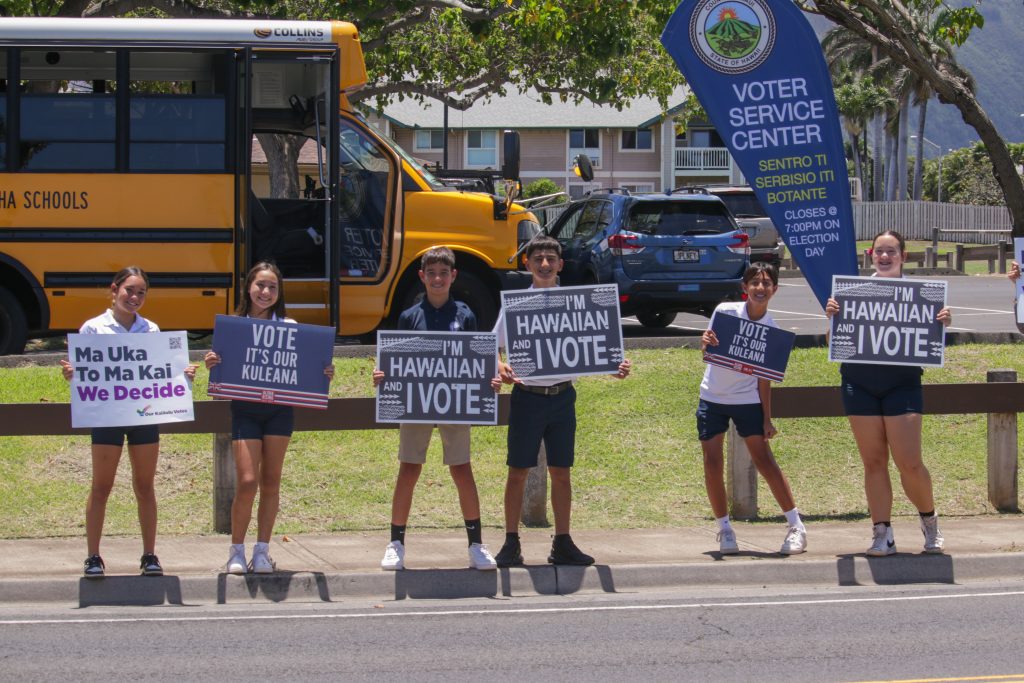 Dozens of ‘ōiwi, kama‘āina, and first-time voters in Honolulu, Hilo and Wailuku gathered to cast their ballots at the drop boxes, wave signs and encourage others to do the same. Seniors from Kamehameha Schools Kapālama, Kamehameha Schools Maui, Kamehameha Schools Hawaiʻi and Ka ʻUmeke Kāʻeo Public Charter School participated in the gatherings ahead of casting their ballots for the very first time.