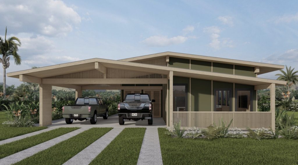 One of the housing types is the Hale Lāʻau, a 1,134-square-foot, one-bedroom, one-bathroom accessory dwelling unit that is designed with prefabricated cross-laminated timber panels. (Minimum lot size, 40-by-80-feet.) The other is 1,326-square-foot Hale Nui Lāʻau, which features three bedrooms and two bathrooms. (Minimum lot size, 52-by-88-feet.) It’s also built with cross-laminated timber. It serves as the main dwelling for Hale Lāʻau.